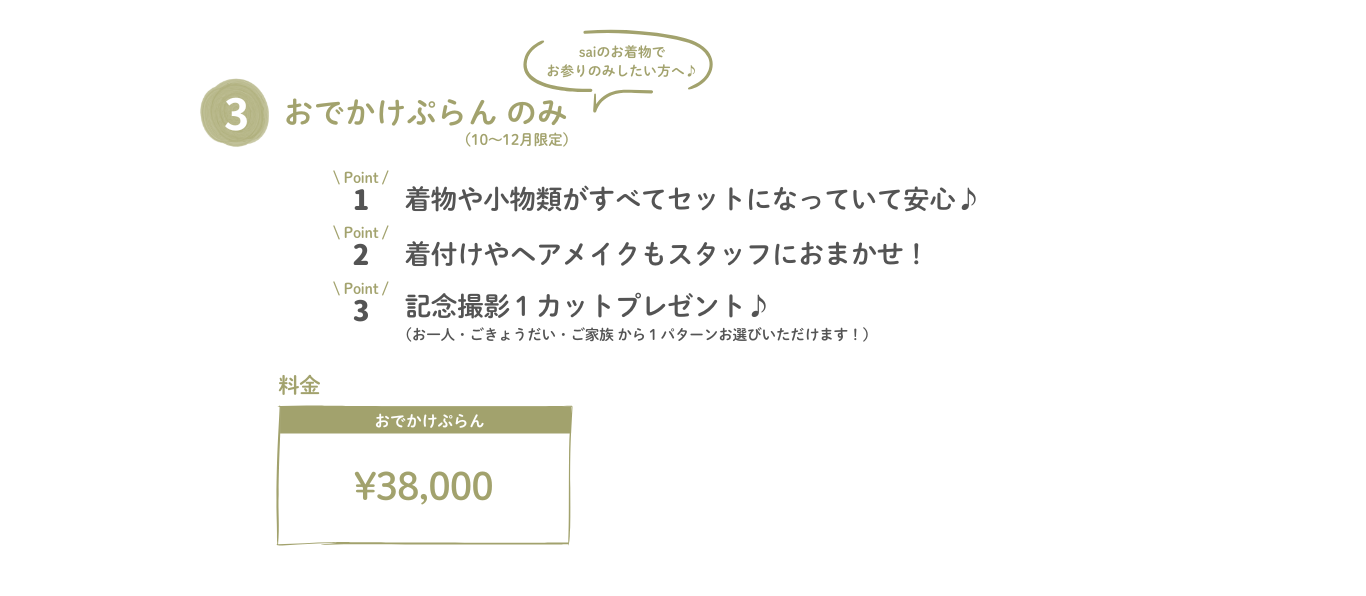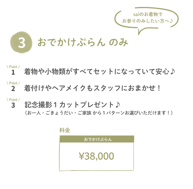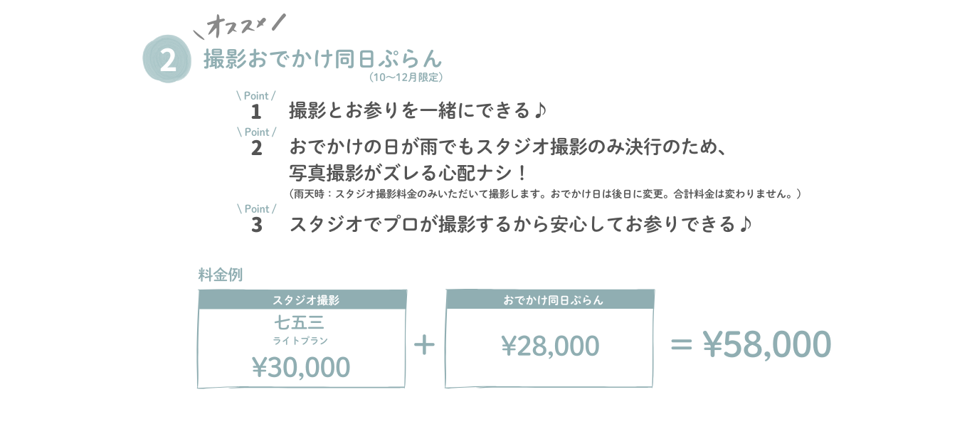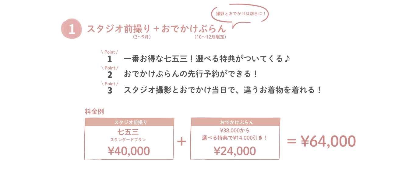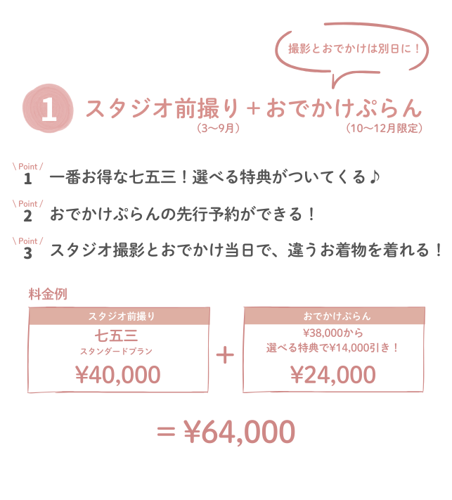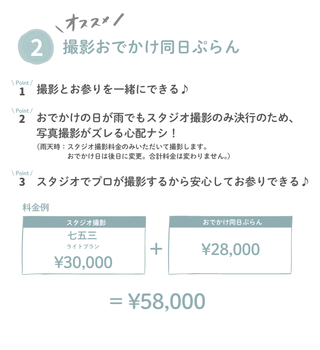 - 3. 雨天での日程変更は、七五三撮影+おでかけぷらん(同日)の場合、七五三スタジオ撮影のみ行います。おでかけぷらんのみ日程変更の対応になります。